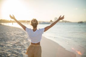 A woman enjoying the beach at sunset, symbolizing Libra season’s harmony, balance, and inner peace.